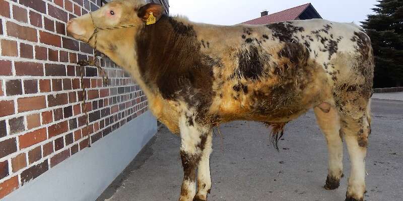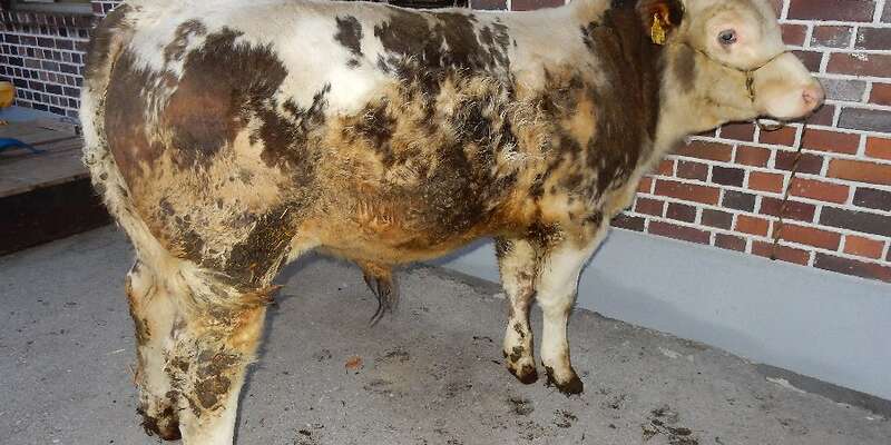 Mutter: Fleckvieh, Vater: Besamungsbulle PIC, Weiß-Blauer-Belgier.
