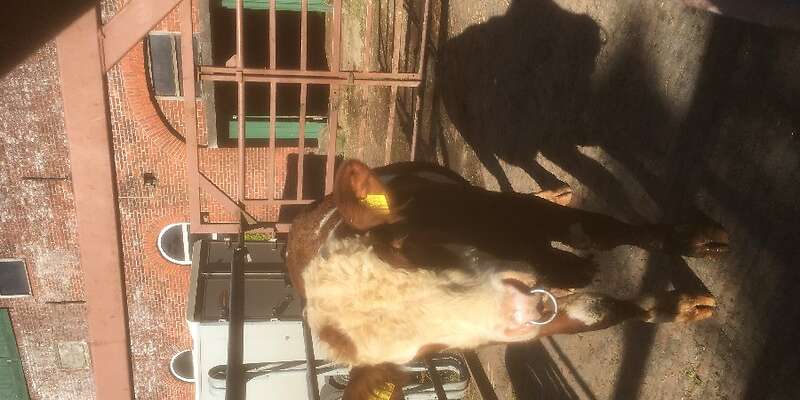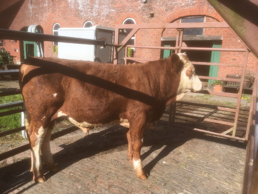 Fleckvieh-Fleischbulle, genetisch hornlos, mit gutem Exterieur und anspruchsvollem Interieur zu verkaufen. Herdbuch.
