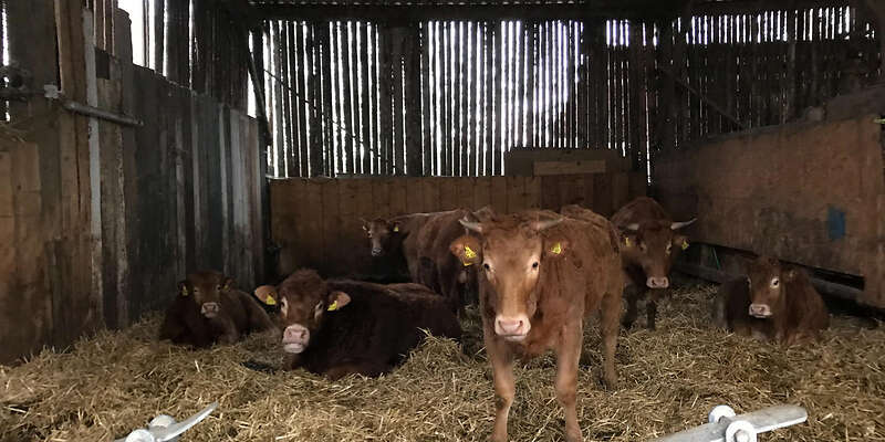 Kleine Limousine Herde abzugeben 1 Deckbulle, 1 Kuh Kalb am Fuß, 3 tragende Kühe, 3 Jährlinge