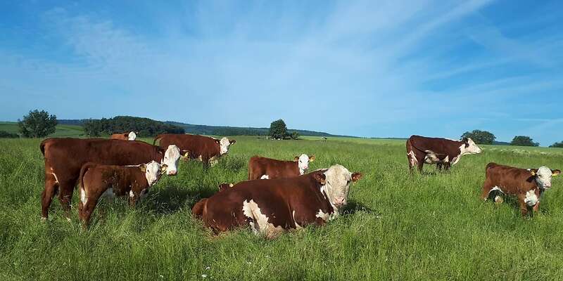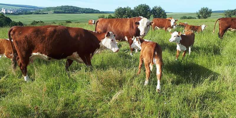 mehrere angedeckte Hereford-Kühe mit Kalb bei Fuß, 2. und 3. Kalbung, aus Hereford-Reinzucht
