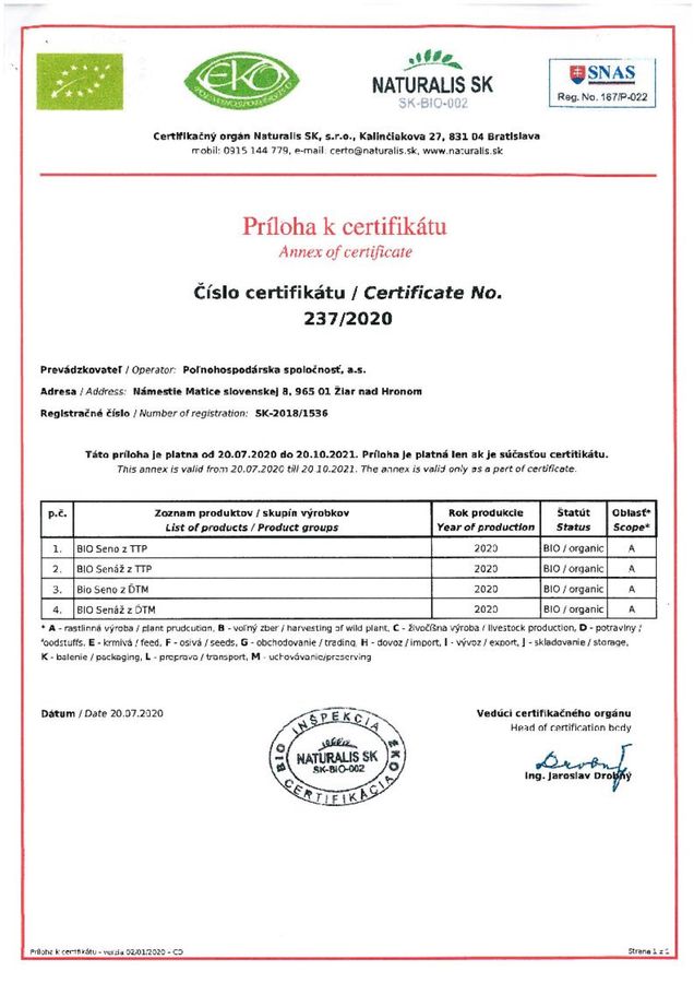Wir sind eine kleine Bio-Farm die ökologisch wirtschaftet in einer Dorf Lutila (Slowakei). Wir wirtschaften auf eine Fläche von rund 500ha, haben 130 Rinde (für Fleisch). Da wir dieses Jahr höhere Produktion erwarten, wir bieten Rundballen von Bio-Heu aus Wiesen mit einem Zertifikat einer Inspektionsorganisation mit BIO-Status zum Verkauf an. Die Ballen werden von einer modernen Presse mit variabler Kammer gepresst. Die Ballen haben einen Durchmesser von 125 cm. Das Heu ist trocken und wird das ganze Jahr über im Heulager unter dem Dach gelagert. Unser Hof ist für LKWs zugänglich, hat gute Anbindung an die Autobahn. Bei Interesse können wir die Verladung des Heus auf den LKW und den gesamten Transport zum Hof des Käufers sicherstellen. Preis 30 EUR ohne MWSt/Ball auf unserem Hof (966 22, Lutila, Slowakei).