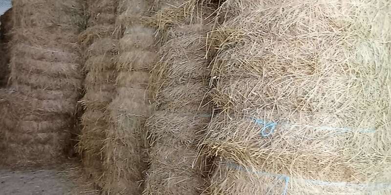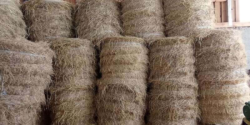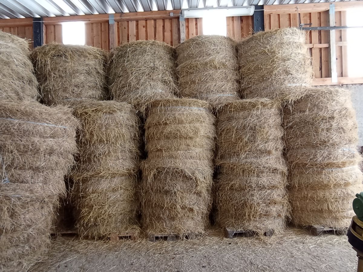 Die Ballen sind trocken in einer Halle auf Paletten gelagert.