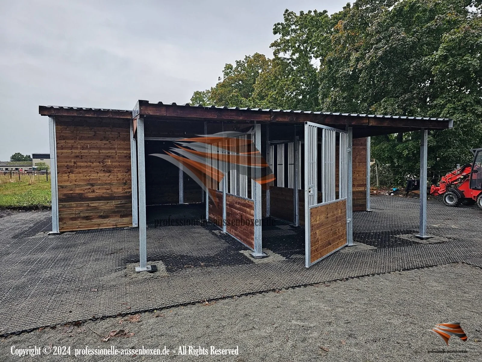 AUSSENBOXEN bietet hochwertige Unterstände und Überdachungen für Pferde, ideal für Weiden, Paddocks und Fütterungsbereiche.