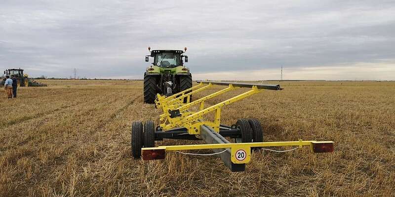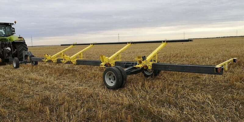 "Carrello 2 Axes" ist für den Transport von Getreidesammlern aller Art mit einem Gewicht von bis zu 5 Tonnen und einer Schnittbreite von bis zu 12 m auf unbefestigten Wegen und öffentlichen Straßen in Verbindung mit einem Mähdrescher ausgelegt.