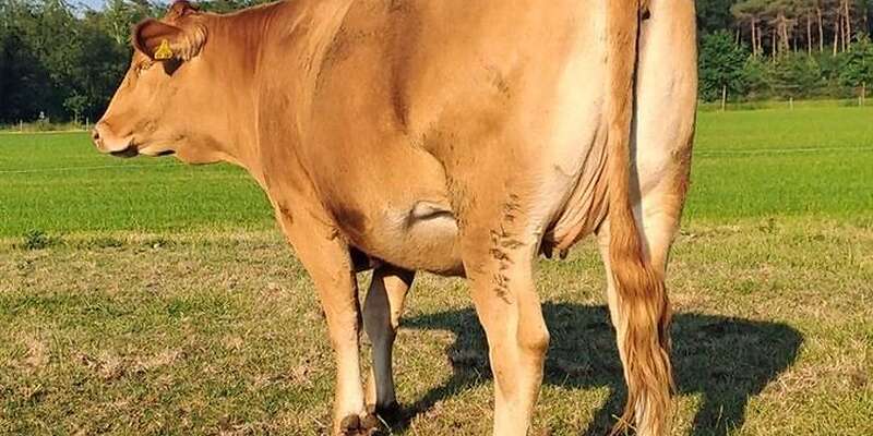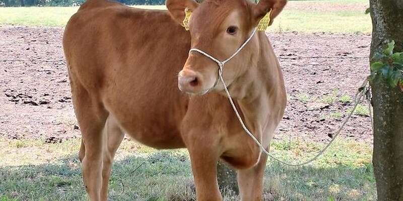 Dieses rote Jungrind ist überdurchschnittlich gut entwickelt und stellt, weil sie genetisch hornlos ist, schon eine Besonderheit da.