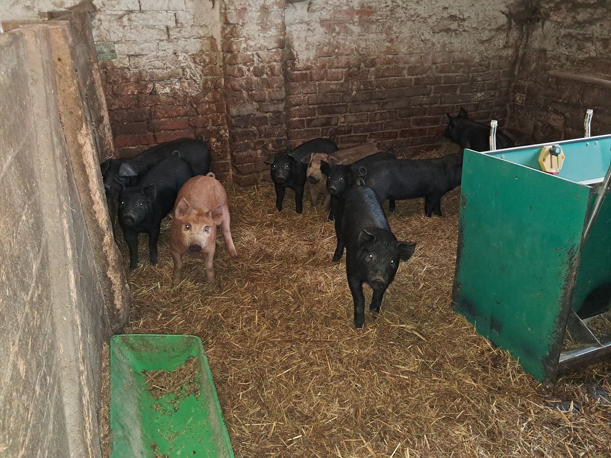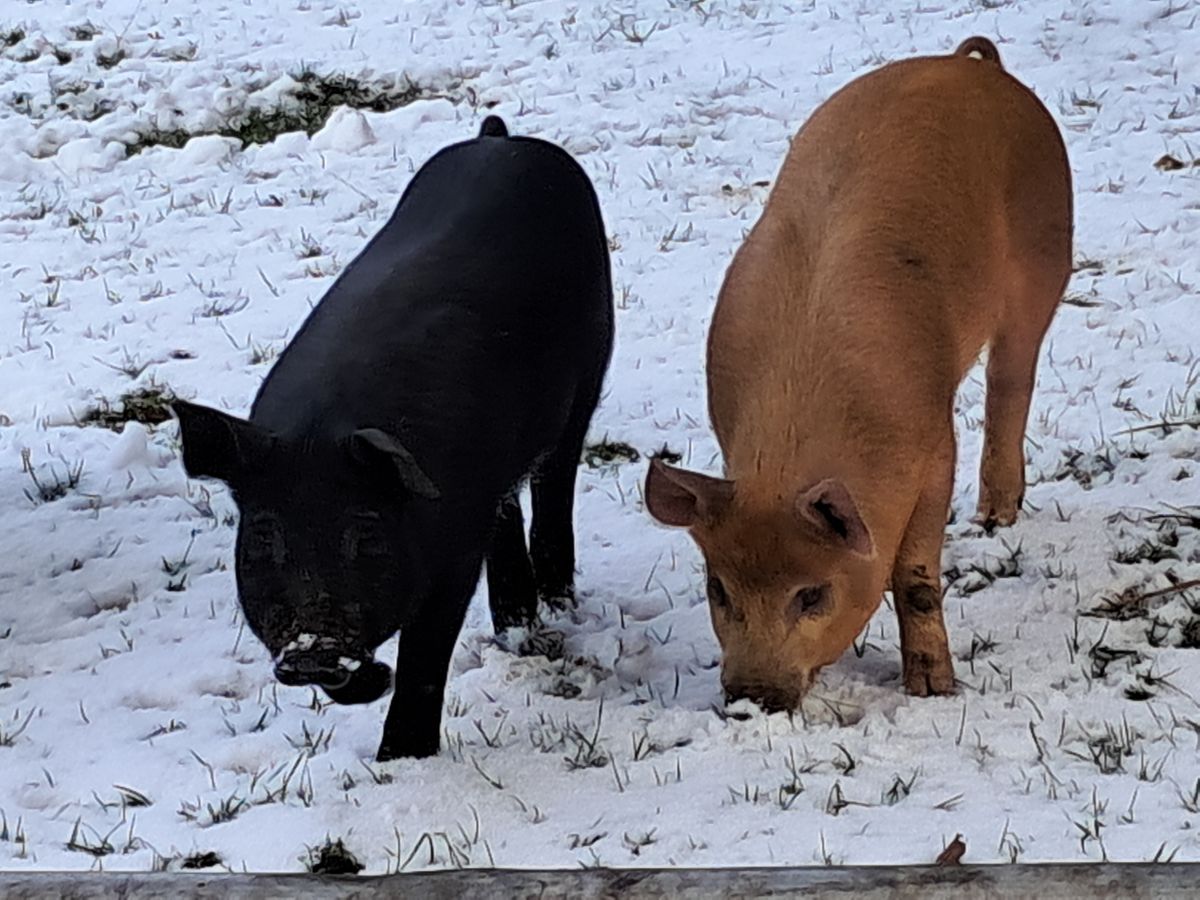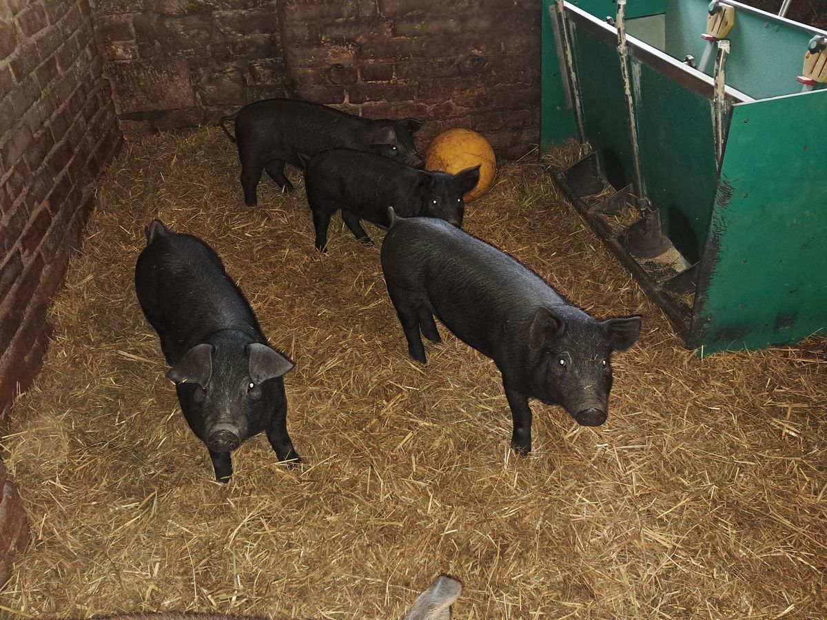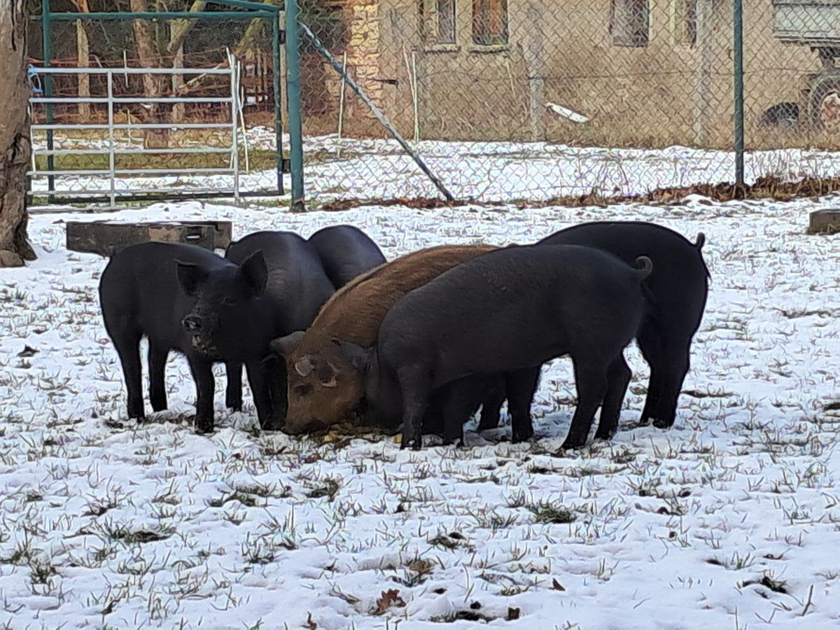 Die Ferkel sind am 18.12.2024 geboren, waren 8 Wochen an der Sau und sind jetzt abgesetzt und bereit für ein neues Zuhause. Unsere Schweine werden im Stall mit Stroh und Auslauf im Garten gehalten und fressen Kartoffeln und Schrot. Sie haben viel Kontakt zu allen Familienmitgliedern so dass die Schweine sehr zahm sind.