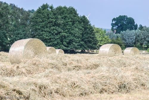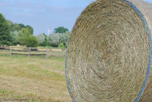 Die Rundballen sind 150 cm im Durchmesser und trocken gelagert.