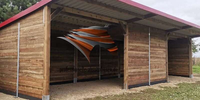 AUSSENBOXEN bietet hochwertige Unterstände und Überdachungen für Pferde, ideal für Weiden, Paddocks und Fütterungsbereiche.