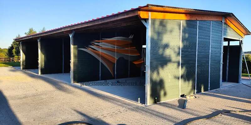 AUSSENBOXEN bietet hochwertige Unterstände und Überdachungen für Pferde, ideal für Weiden, Paddocks und Fütterungsbereiche.