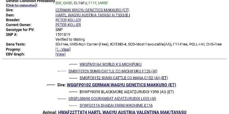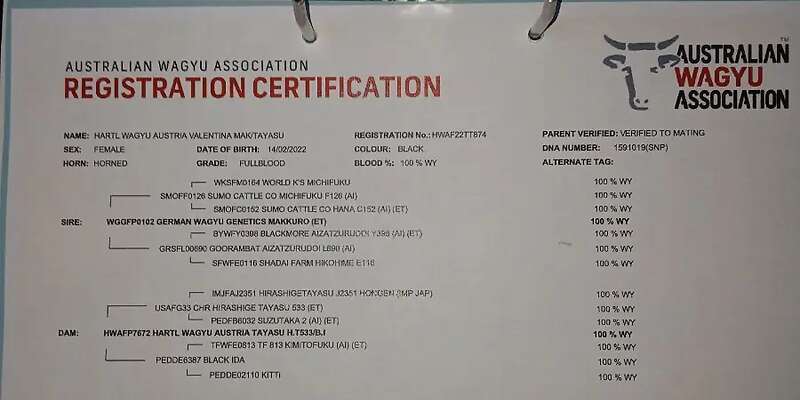 Vergebe wegen Überzahl großrahmige FB Wagyu Kuh 100% WG. Valentina ist 3,5 Jahre alt, Vater: Makkuro DE, MV: Hirashige Tayasu 533. Tayasu Linie, also schwere große Tiere. Sie hat 2x gekalbt. Zurzeit nicht tragend, kann aber auf Wunsch belegt werden. Registriert im australischen Herdebuch bei der AWA, EBV's, erbfehlerfrei, enthornt.