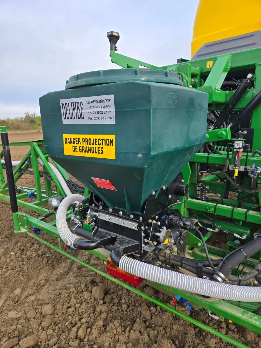 Die DELIMBE T15 Spritze ist eine vielseitige landwirtschaftliche Sämaschine, mit der verschiedene Samen oder Granulate ausgebracht werden können.