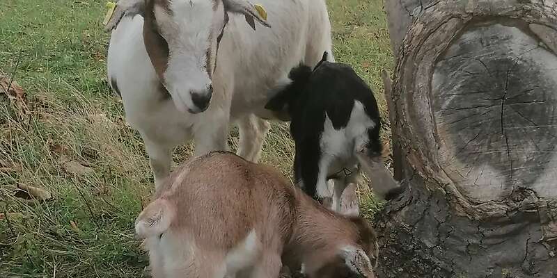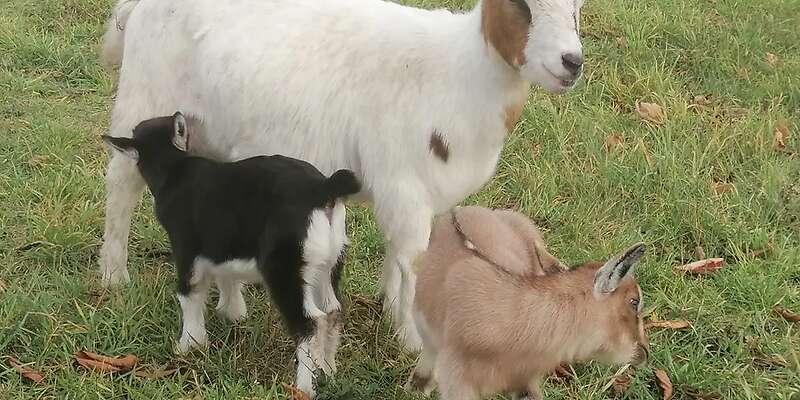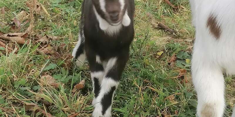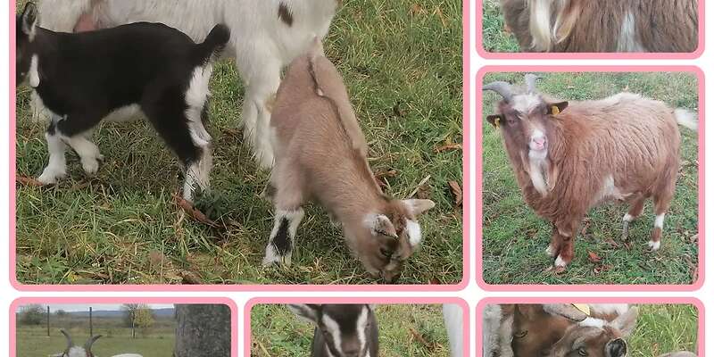 Verschenke 4 Zwergziegen. Einen einjährigen Bock in Schoko Weiß und eine Einjährige Ziege mit 2 Bocklämmern.Diese sind ende Oktober 2025 geboren.