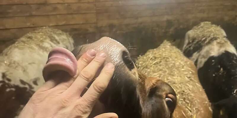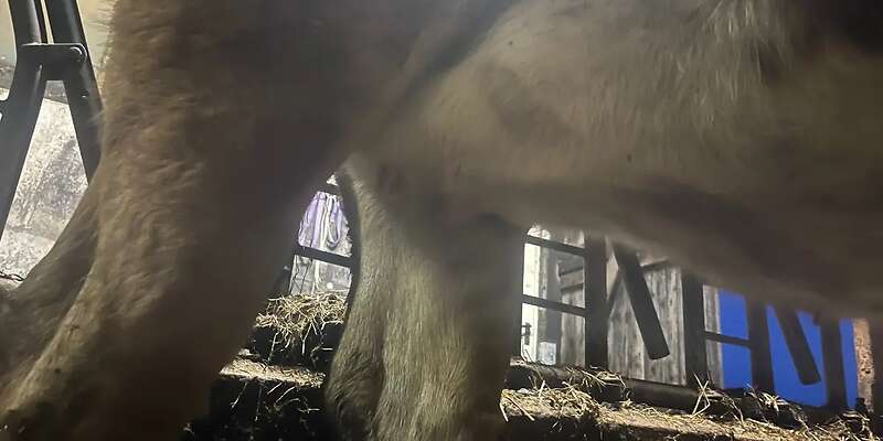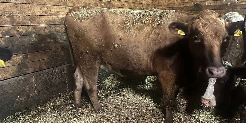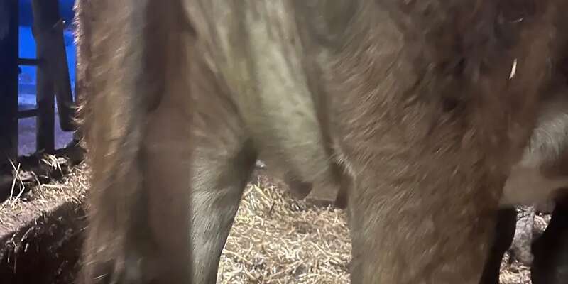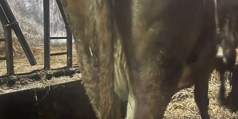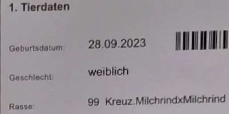 Die Kalbin hat neun Monate Trächtigkeit am 22.12 erreicht. Mutter Braunvieh und Vater Holstein-Rotbunt (Deckbulle).