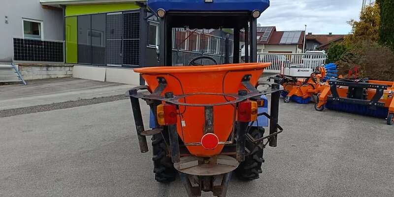 Winterdiensttraktor mit Vollkabine, Schneeschild und Streuer.