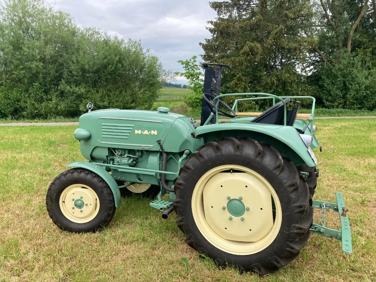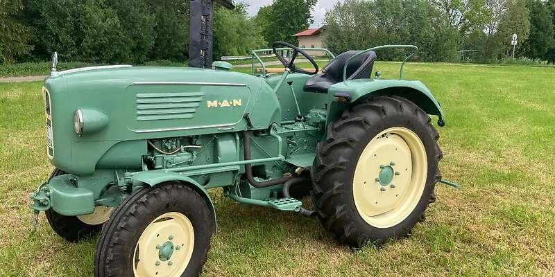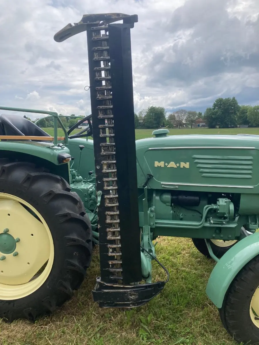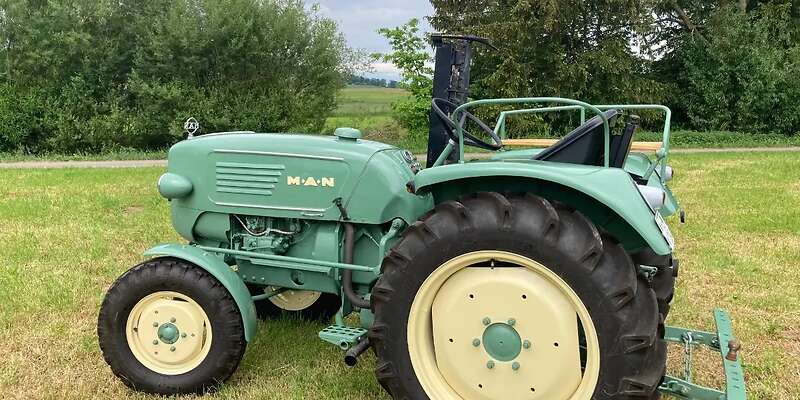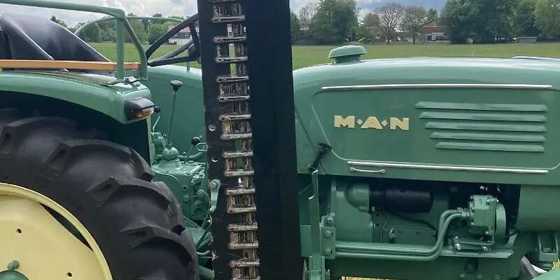 Wir verkaufen einen sehr schönen restaurierten MAN 2L4 Traktor mit 25 PS, Hinterradantrieb, funktionsfähigen Raspe-Seiten-Mähwerk und Hydraulik.