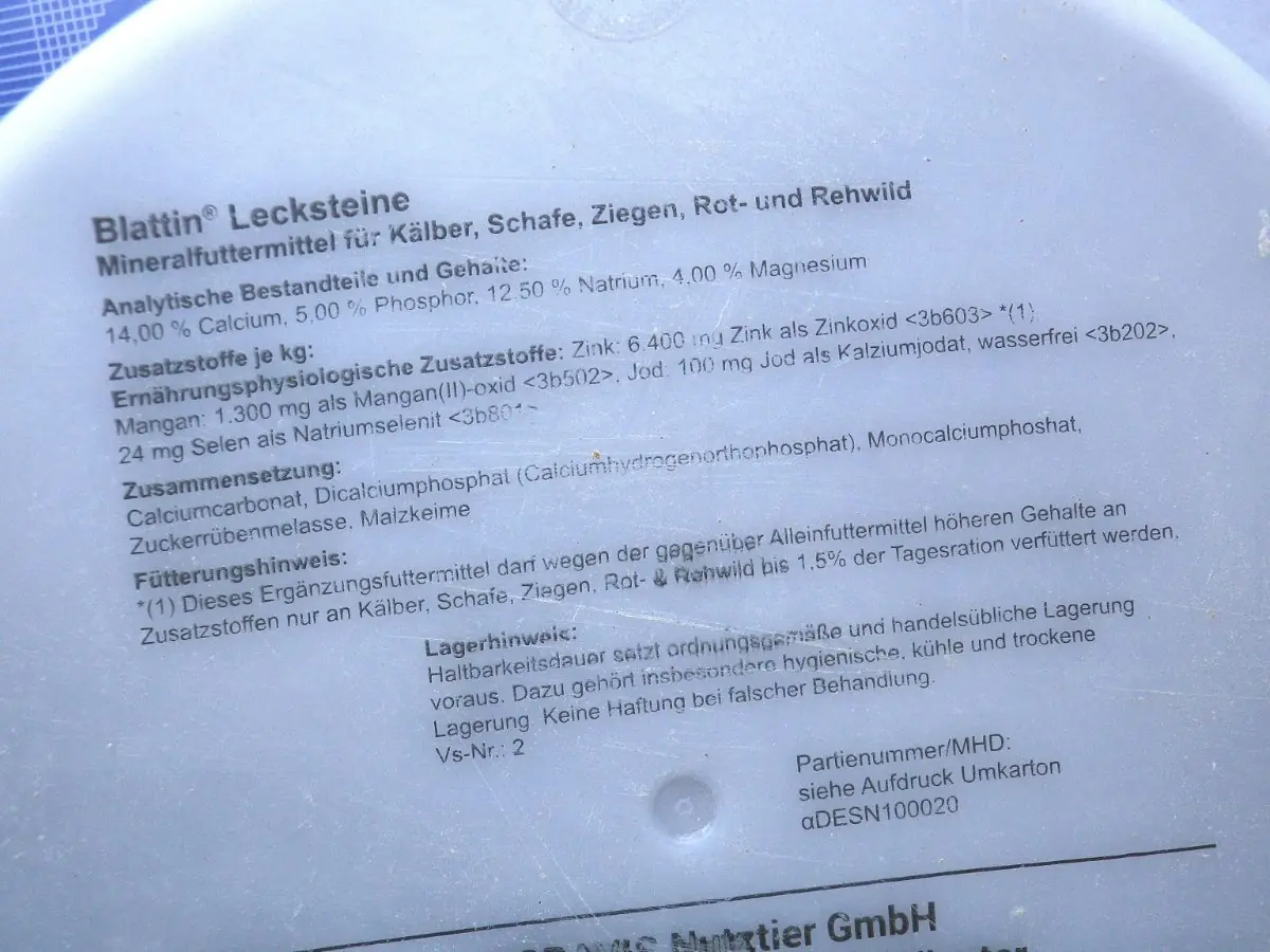 6400 mg Zink als Zinkoxid (3b603), 1300mg Mangan als Mangan(II) -oxid (3b502), 100 mg Jod als Kalciumjodat ( 3b202), 24mg mg Selen als Natriumselenit (3b801)