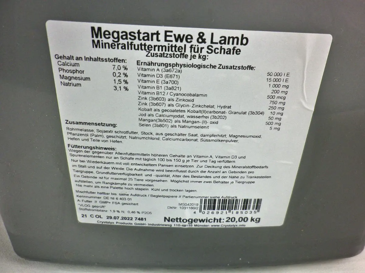 MEGASTART wird in den letzten sechs Wochen vor dem Lammen eingesetzt. Der durchschnittliche Verzehr beträgt 100 bis 150 Gramm je Mutterschaf und Tag. Je Gebinde sollten maximal 20 Tiere vorgesehen werden. Wenn möglich immer zwei Behälter pro Tiergruppe aufstellen, um Rangkämpfe zu vermeiden.