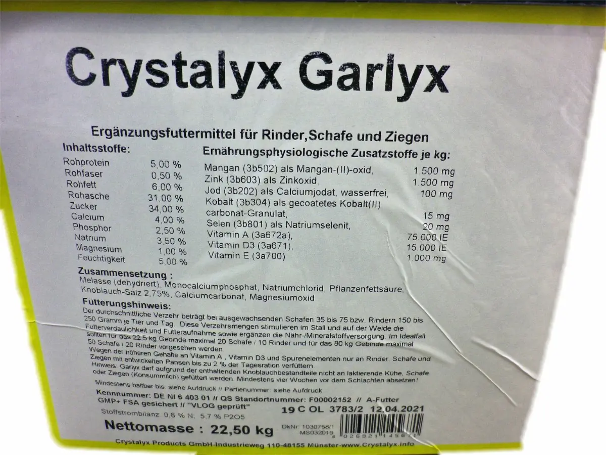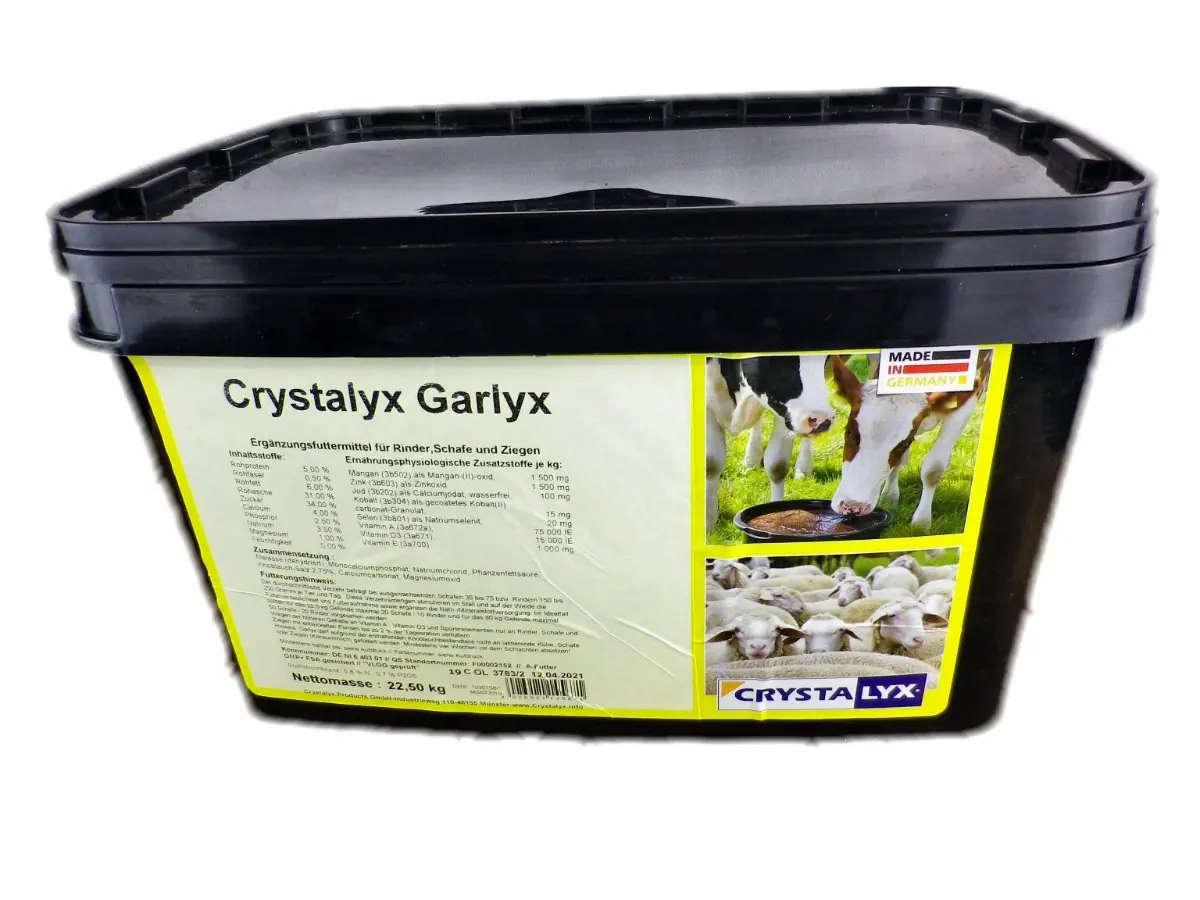 CRYSTALYX® Garlyx ist ein energiereiches Ergänzungsfuttermittel zum Lecken für Rinder, Schafe, Ziegen und Gatterwild.