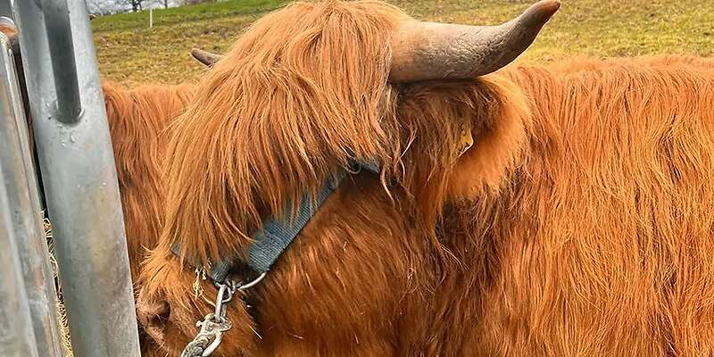 Unsere schottischen Hochlandrinder leben ganzjährig auf der Weide, sind umgänglich sowie Elektrozaun, Fress-Fanggitter Schlepper und Menschen gewöhnt.