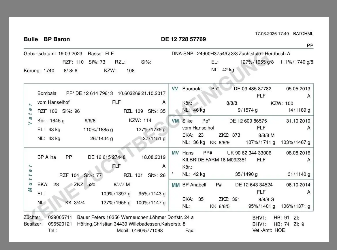 Der Bulle ist im Herdbuch geführt, aktuelle Bescheinigung dazu bei den Bildern.