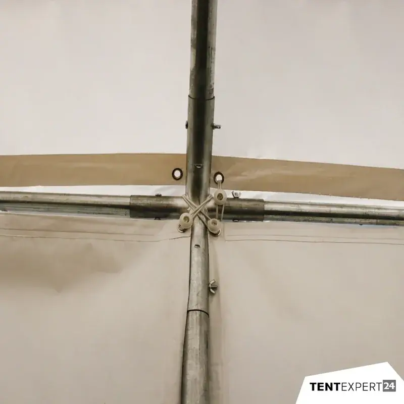 Geräumig & Hell: Mit einer Grundfläche von 32 m² und einer Höhe von 2,3 m bietet das Zelt in neutralem Weiß viel Platz und eine angenehme Lichtdurchlässigkeit.