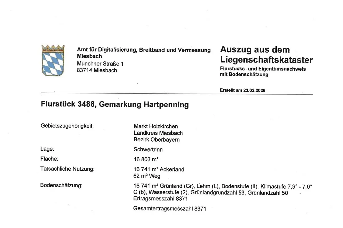 Die Bodenschätzung weist solide Ertragswerte auf: Bodenstufe II, Klimastufe 7,9–7,0 C (b) sowie Wasserstufe 2. Mit einer Grünlandgrundzahl von 53 und einer Grünlandzahl von 50 bietet die Fläche gute Voraussetzungen für eine nachhaltige Nutzung. Die Ertragsmesszahl beträgt 8.371 und unterstreicht die landwirtschaftliche Qualität des Grundstücks.