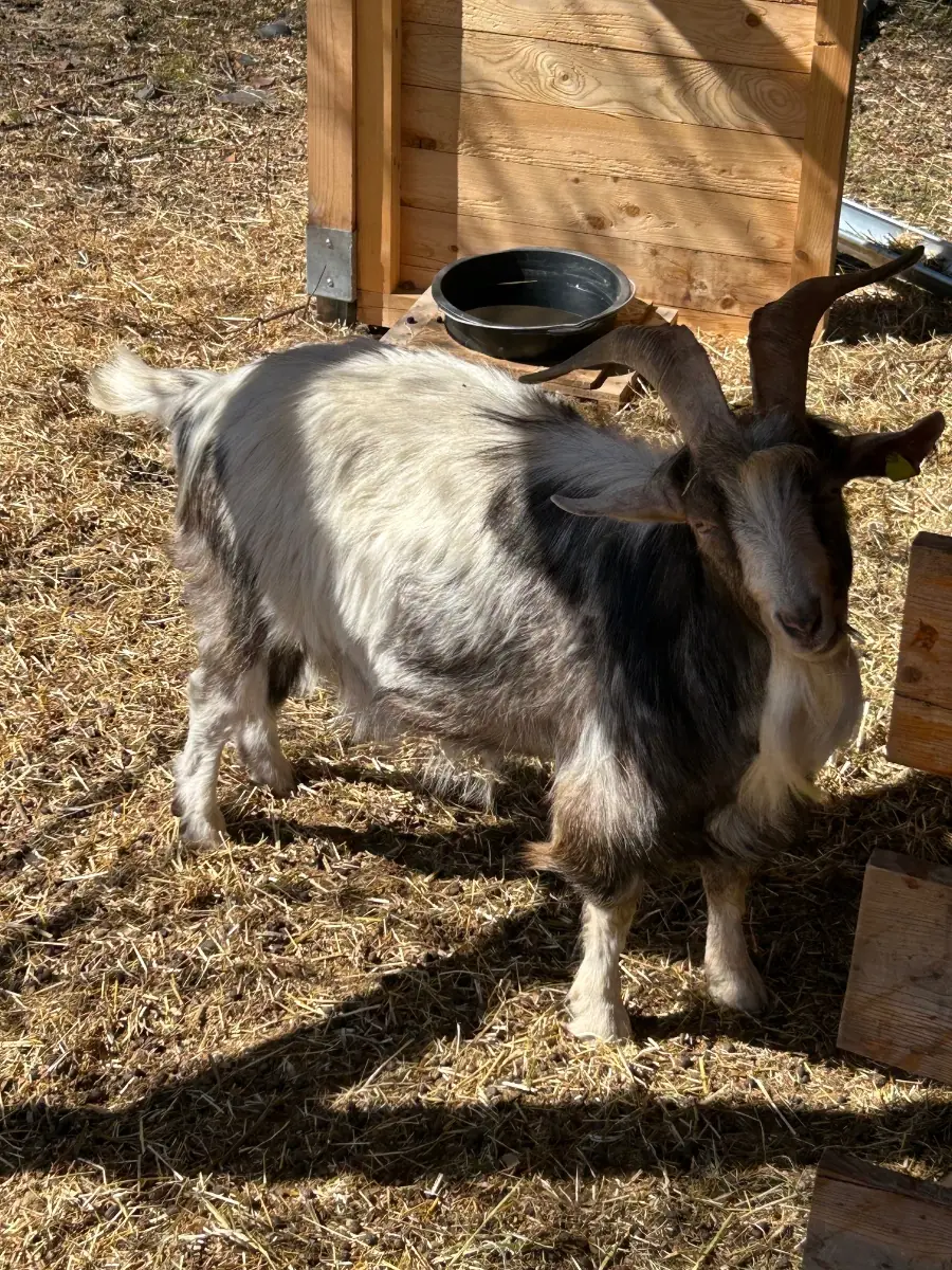 Wir geben unseren schönen, nicht kastrierten Ziegenbock Jakob ab. Er ist 4 Jahre alt, gesund und sehr friedlich. Er lebt hier mit zwei Geißen, die jetzt vor kurzem beide ein Kitz von ihm bekommen haben. Um Inzucht zu vermeiden müssen wir ihn nun leider abgeben.